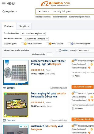 Search on Alibaba.com: more than 41,000 hits for the search term “security hologram”