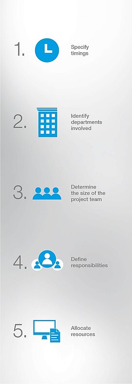 The size of the project team naturally depends on the scope of the project as well as the size of the company. But it’s important to remember: less is more. Only the departments concerned should have a colleague representing them on the team. If the project team is too big it slows down the decision-making process.