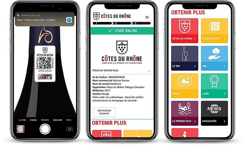 Nachdem der Originalitätsnachweis des Weines erbracht ist, werden dem Kunden weitere Informationen angeboten: Details zum Wein, Website des Herstellers, Website der Côtes du Rhône, lokale Händler, Gewinnspiele, Kalorienangaben, Umweltmaßnahmen u. v. m. Und: Der Kunde kann einfach mit dem Hersteller des Weins in Kontakt treten. Der Hersteller selbst kann über eine intuitive digitale Plattform seine Garantiemarkierungen verwalten. Alle Scans der Garantiemarkierungen werden mit Ort- und Zeitangabe im System gespeichert, sodass der Hersteller genau weiß, wo sich seine Weine befinden.