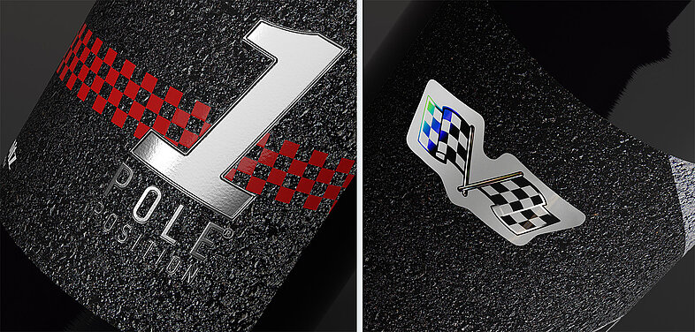 The design developed in cooperation with Willi Opitz for the Pole Position series uses TRUSTSEAL® security features to combine forgery-proof marking with aesthetic depth effects. The use of diffractive structures creates a striking visual dynamic that appears different depending on the viewing angle – the dark elements light up in green when tilted over the horizontal axis. The label combines various optical effects that create a three-dimensional perception.