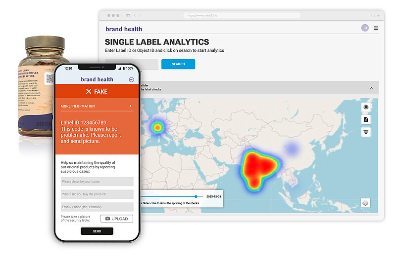 Toutes les solutions de sécurité de KURZ SCRIBOS peuvent être connectées à SCRIBOS 360, notre plateforme numérique de protection de la marque, sur laquelle les événements d’authentification sont vérifiés, enregistrés et analysés. Les contrôles individuels sont transformés en informations exploitables qui soutiennent les enquêtes et les mesures coercitives sur le terrain.