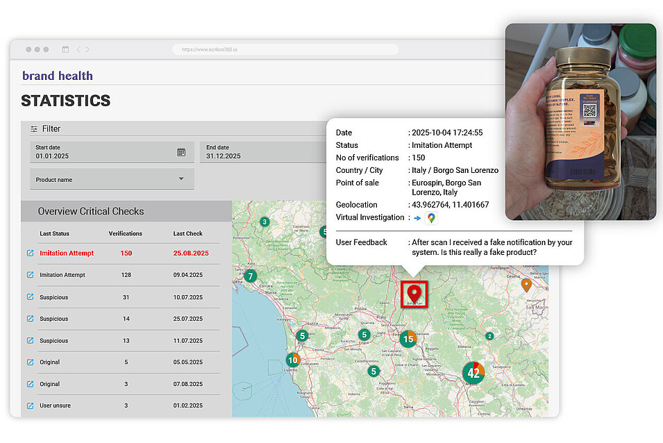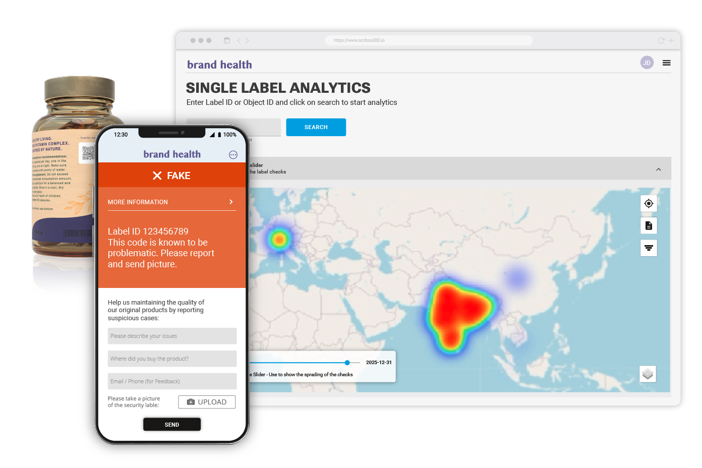 Each scan is automatically checked against the SCRIBOS 360 database to confirm authenticity. If a product appears suspicious, users receive an immediate alert and can submit feedback directly via the system.